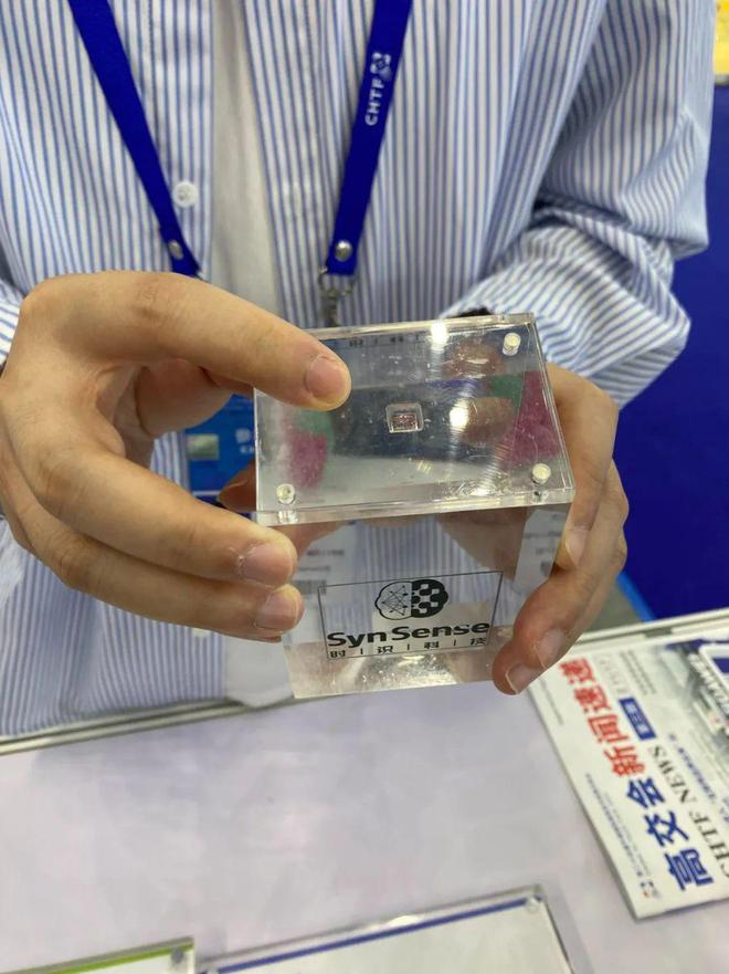 工作人员向记者展示放在桌子角落的时识科技的类脑芯片,他不说想必没人留意到这个迷你展品。本刊记者摄
