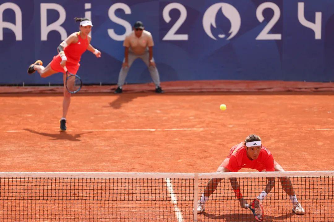 8月1日,在巴黎奥运会网球混双半决赛中中国组合张之臻/王欣瑜对阵荷兰组合