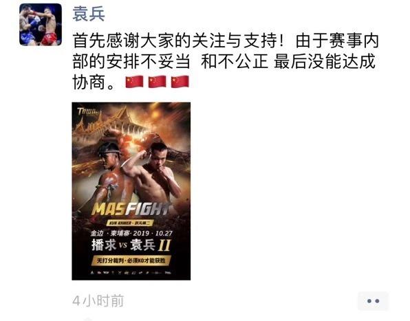 今天早上,袁兵在自己的社交平台宣布,自己将退出和播求的二番战。