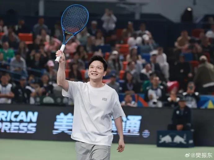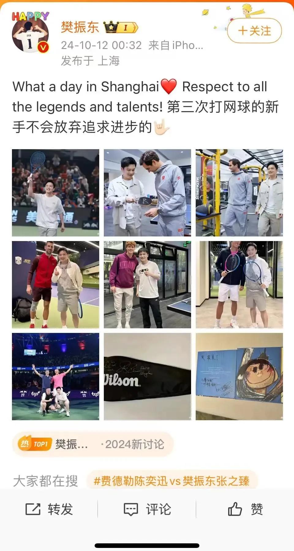 樊振东:What a day in Shanghai❤️Respect to all the legends and talents!第三次打网球的新手不会放弃追求进步的??