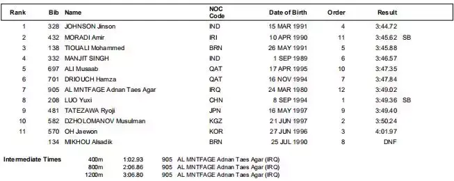赵长虹第三,朱仁学第五。原本第三个撞线的印度选手犯规,取消成绩。