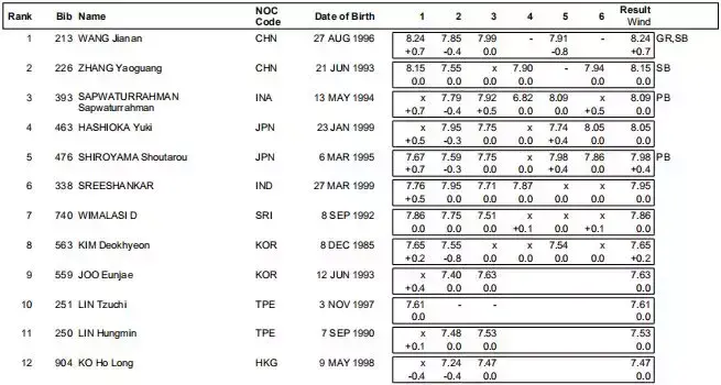 王嘉男和张耀广包揽前两名,且都超越了原亚运会纪录8.14米。