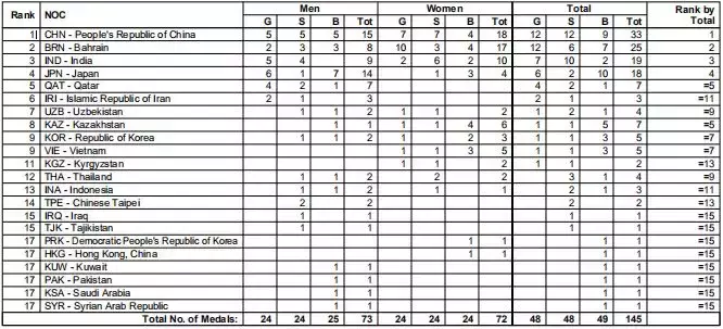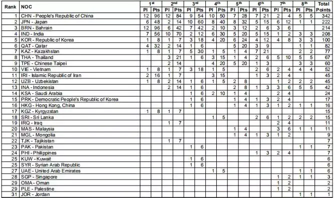 这是根据各单项前八名积分相加的榜单,中国、日本、巴林、印度和韩国位居前五名。