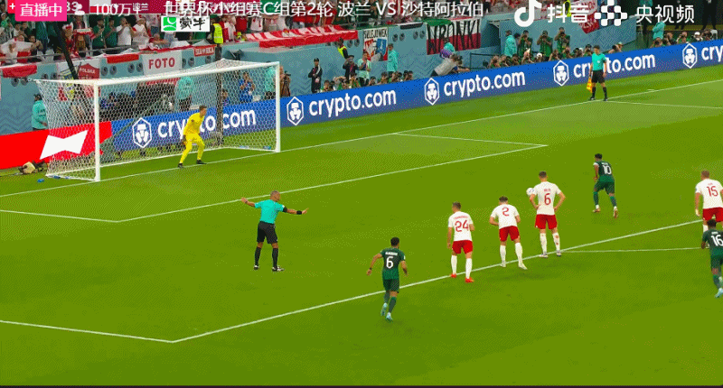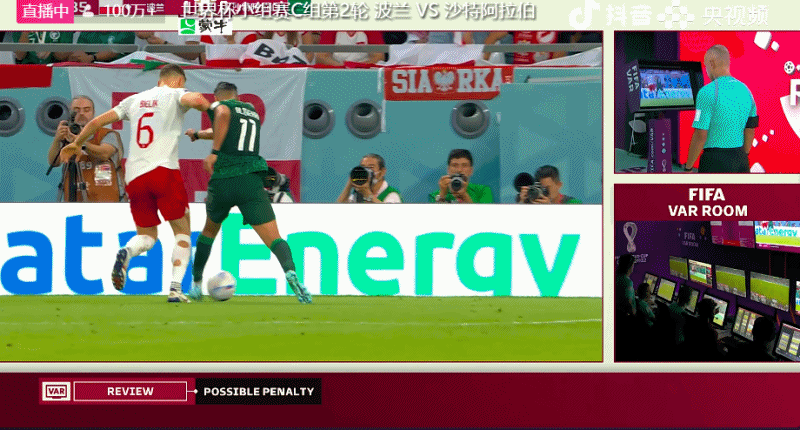 第44分钟,沙特队的谢赫里在波兰队禁区内控球时被别利克踢倒,裁判观看VAR后给了沙特队一个点球。