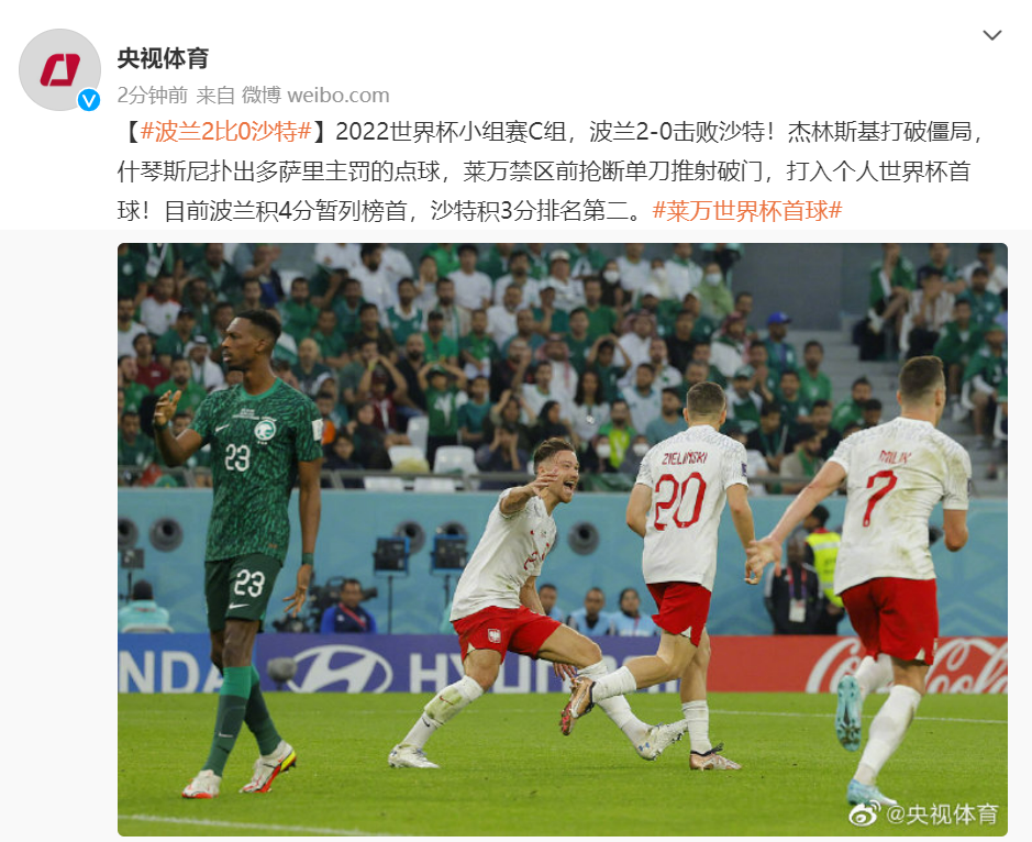 2022世界杯小组赛C组,波兰2-0击败沙特!杰林斯基打破僵局,什琴斯尼扑出多萨里主罚的点球,莱万禁区前抢断单刀推射破门,打入个人世界杯首球!目前波兰积4分暂列榜首,沙特积3分排名第二。