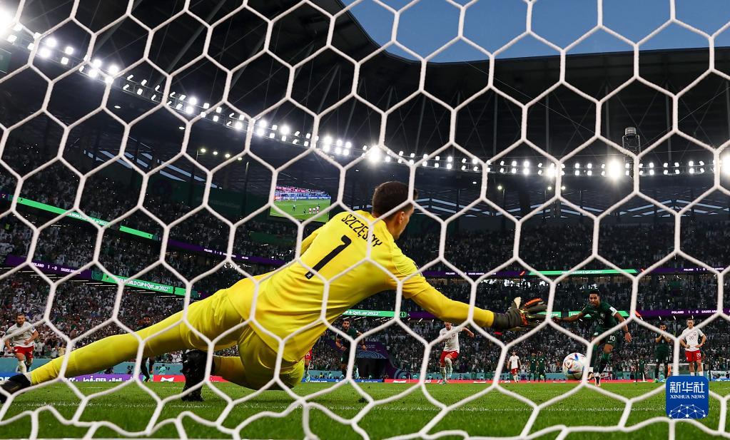 11月26日,波兰队守门员什琴斯尼扑出沙特阿拉伯队球员萨勒姆-达瓦萨里的点球。新华社记者 丁旭 摄