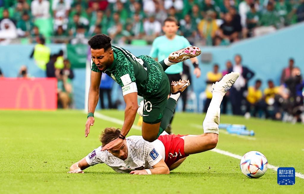 11月26日,沙特阿拉伯队球员萨勒姆-达瓦萨里(左)与波兰队球员别力克拼抢。新华社记者 辛悦卫 摄