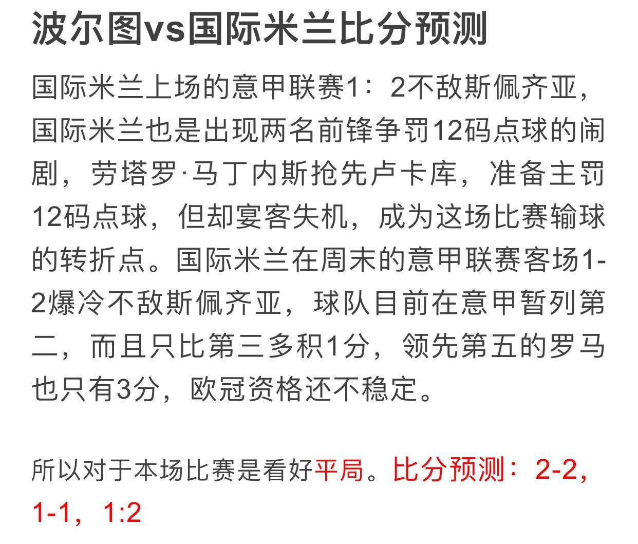 波尔图 平手 国际米兰 竞彩不让球推荐:3、1