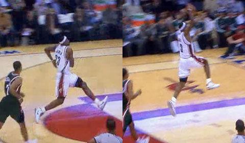 除了720°转身扣篮外,白乔丹还有一个成名绝技,那就是“飞檐走壁”,从图中不难看出白乔丹在扣篮前甚至在墙壁上蹬踏了两脚!当年白乔丹在NBA多伦多全明星赛上表演了“蝎子摆尾”扣篮同样也是技惊四座,在那次表演中他也是让韦德和安东尼等大佬惊掉下巴。