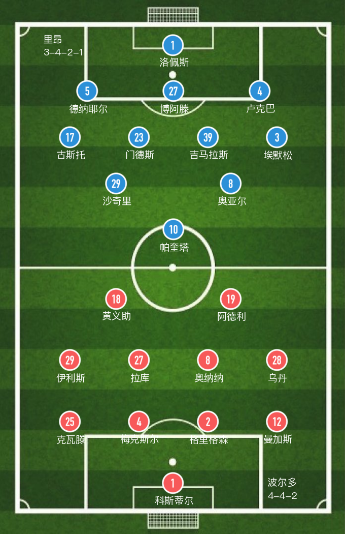 里昂(3-4-2-1): 1-洛佩斯,5-德纳耶尔(44' 21-达席尔瓦),27-博阿滕(76' 25-卡克雷),4-卢克巴,17-古斯托,23-门德斯,39-吉马拉斯,3-埃默松(76' 7-埃坎比),29-沙奇里(66' 9-登贝莱),8-奥亚尔,10-帕奎塔