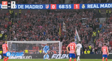 第90+5分钟,哈维-加兰左路送出精妙直塞,科雷亚跟进单刀机会过掉库尔图瓦跌跌撞撞打门得分,边裁第一时间举旗,但VAR介入后确认进球有效,马竞1-1绝平↓