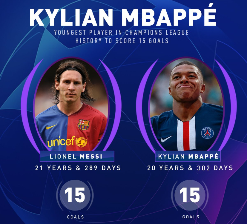 1、超越梅西,以20岁零302天成为欧冠队史最年轻打进15球的球员;