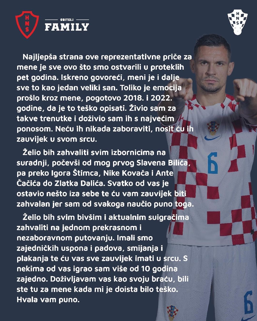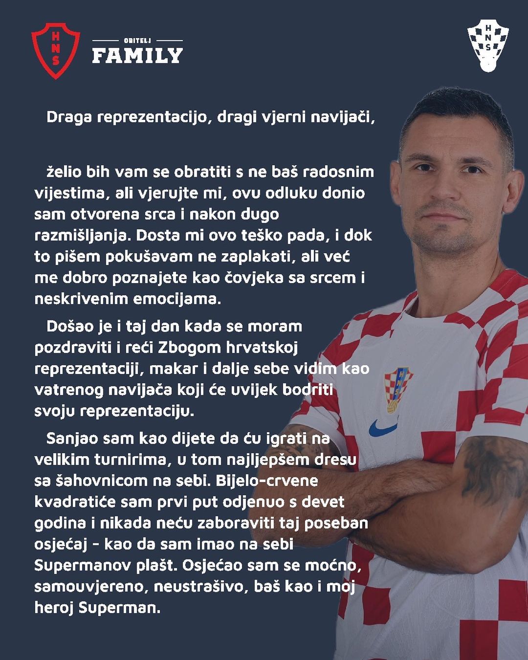 我和克罗地亚国家队说再见的时刻到来了,当然我永远会是国家队的超级粉丝,会关注球队未来的每一场比赛。