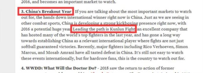 搏击运动东半球的崛起,标志着一个全新时代的开始。对此,考芬写到,“如果大家在谈论目前最重要的搏击市场,那么中国一定是首选。正如我们看到其他格斗项目一样,中国正以一种迅猛势头将自由搏击引入大众视野,2016年将是一个潜在的爆发之年!”他着重写到,“中国搏击主要的引领者是昆仑决(Kunlun Fight)。2015年昆仑决汇集了世界许多顶尖选手参赛,用最激烈的精品赛制横贯全年,并力图将中国朝向世界自由搏击大国的方向而努力开拓。近年来,里克·范霍文等世界巨星都在中国擂台遭遇滑铁卢,说明这里的竞争力已经大幅提升,中国观众对自由搏击的认知程度也在发生着巨大的变化。”