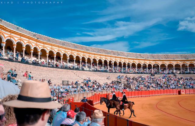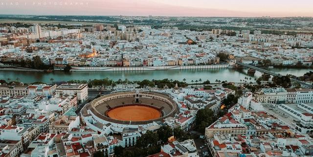 我是航拍的时候才发现,它就在瓜达尔基维尔河旁边。由于场地巨大,在购买门票的时候会分成不同的区域。阴面不会晒到太阳,所以票价会贵一些,正因为票价贵一些,所以斗牛表演的时候也会尽可能地接近这边的座位。我们买的是阳面的票,不过斗牛表演5、6点开始,也没有晒到什么太阳。