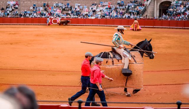 【长矛穿刺】公牛消耗掉最初的锐气之后,骑马带甲的长矛手出场,他们用长矛头刺扎牛背颈部,使其血管刺破,进行放血,同时为主斗牛士开一个下剑的通道。他们骑的马都用护甲裹住,双眼蒙上以防马儿胆小跑掉。
