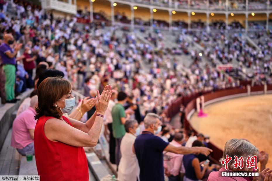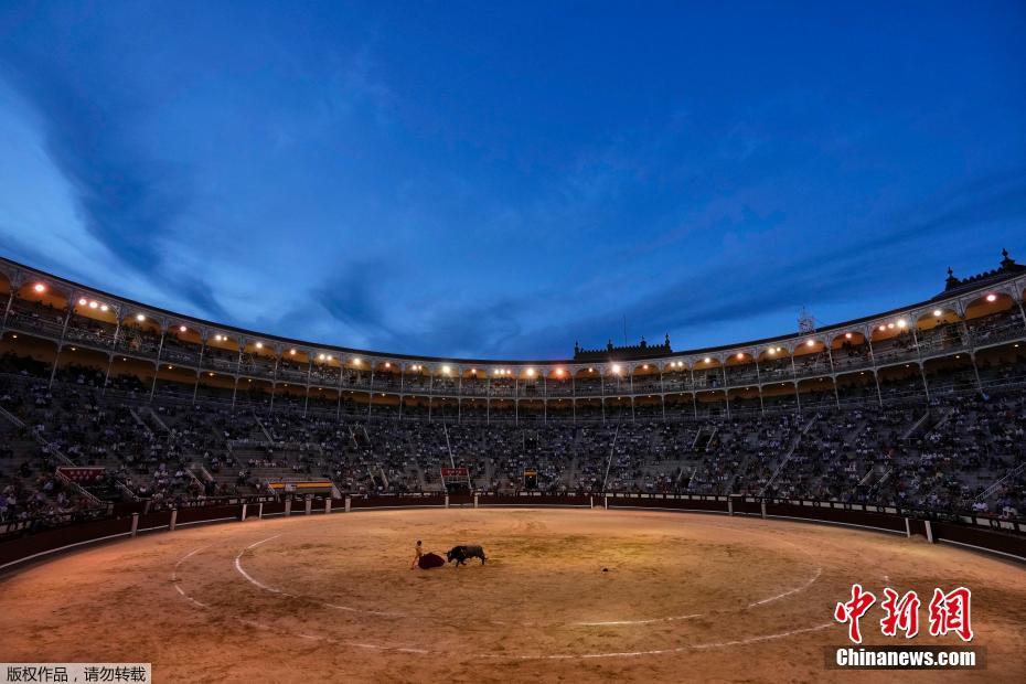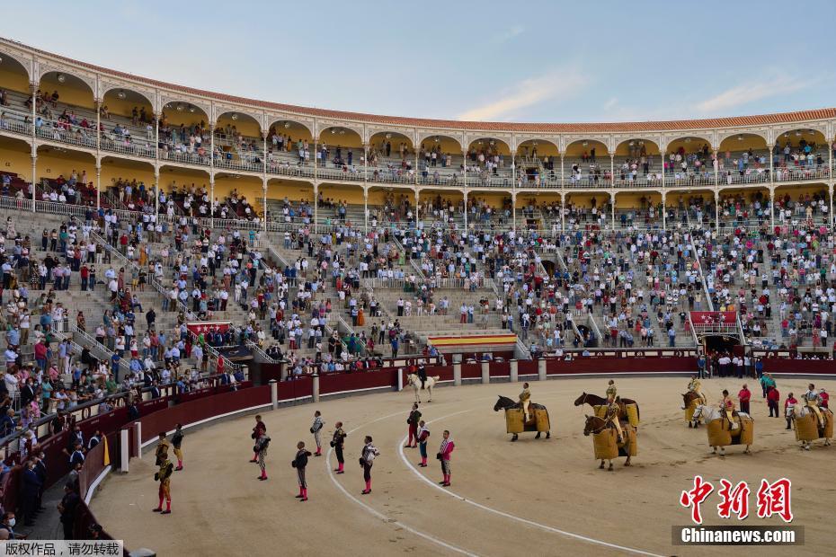 当地时间6月26日,西班牙首都马德里,西班牙最著名的斗牛场拉斯班塔斯斗牛场举行斗牛比赛,民众前来现场观看。