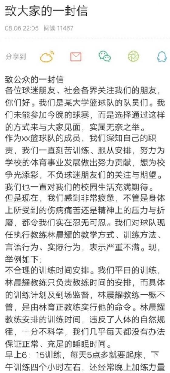 6日晚上10时左右,CUBA季军厦门大学篮球队明星球员、队长黎伊扬在自己的微博上突然发布一封名为《致大家一封信》的公开信,对球队主教练林晨耀提出一系列控诉。主要包括: