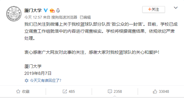 尽管林晨耀随后作出了回应,称自己“身正不怕影子斜”,但针对球员提出的大部分指控,林晨耀并未做出解释。8月7日中午,厦门大学表示已经成立调查工作组进行核实,学校将根据调查结果,依规依纪严肃处理。
