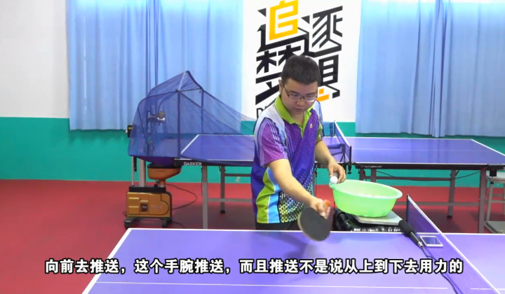 手腕要柔和,要派到正手位手腕向前去推送,推送不是说从上到下去用力,这样用力就成下旋了。要派球不转,把球托过去。以初学者打正手攻球的这个动作,盆子可以离网更近一点,更好控制。把盆子放在桌上派球,手腕派的时候往前托一点。