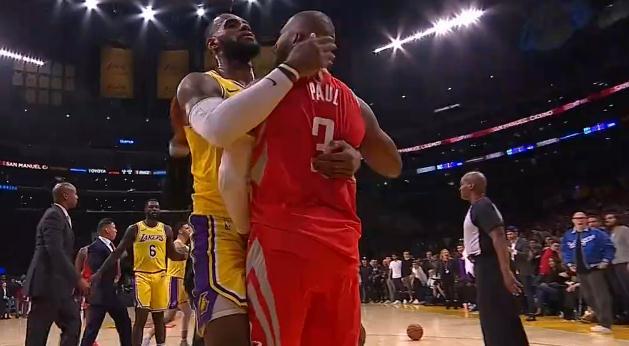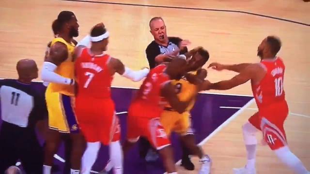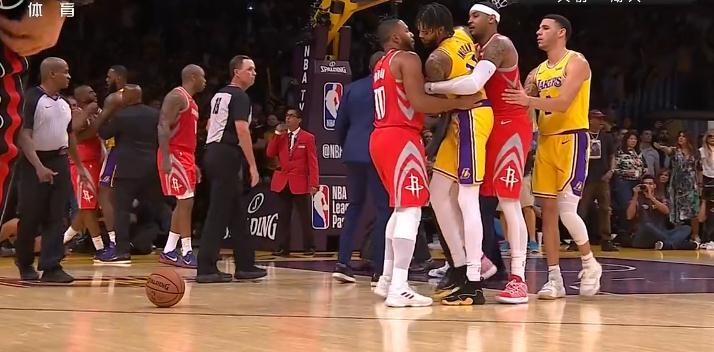 终场结束前的4分13秒,哈登上篮被裁判被英格拉姆犯规,对比哈登,英格拉姆在力量上肯定吃大亏,哈登三步上篮起跳后防守他的英格拉姆直接被撞出了场,这让英格拉姆非常不满,他趁着裁判不注意直接大力推了哈登一把,随后双方球员赶紧前来劝架,在劝架的过程中,克里斯保罗和朗多再次爆发冲突,慢镜头显示,保罗一直戳着朗多的鼻子喷着垃圾话,朗多是什么人啊,保罗狠,朗多也不怂啊。