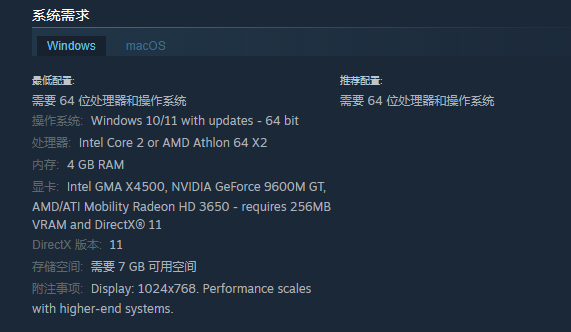 附注事项: These spcs allow for the game to be played in 1080p with graphics settings at "Low".64-bit processor and operation system are required.