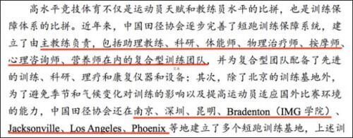 中国田径协会主席段世杰此前在接受采访时表示,目前常年跟队服务的体能师、科研人员和医务人员达到近百人。同时,田径协会签约引入国际科研团队、医疗康复机构,并与国内32家科研单位和企业合作,为运动员训练比赛保驾护航。在两年前的多哈世锦赛上,中国代表团就配置了46人的保障团队,还将日常使用的大型治疗仪器都带到了多哈,这也为中国田径队创造历史性的好成绩提供了有力保障。