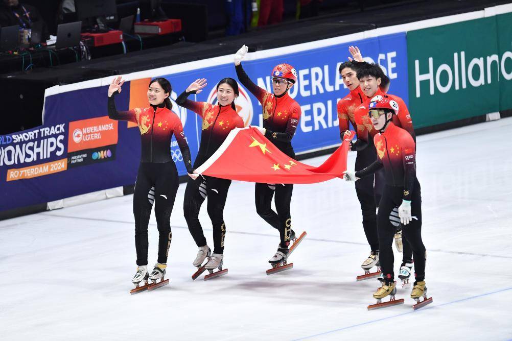 3月17日,中国队在比赛后庆祝。当日,在荷兰鹿特丹进行的2024年国际滑联短道速滑世锦赛混合团体接力决赛中,由范可新、公俐、林孝埈、刘少昂组成的中国队获得冠军。新华社记者 连漪 摄