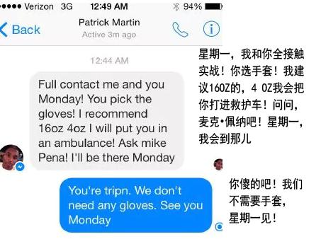 这个名叫帕特里克•马丁的黑人小哥,卯上的是前UFC选手乔什•尼尔(Josh Neer)。马丁似乎是对尼尔的战斗风格十分厌恶,因此经常发短信嘲笑或辱骂他,随后两人在网上开始互喷垃圾话,长达一年之久。最终,二人按捺不住心中怒火,来到了尼尔的拳馆进行约架。