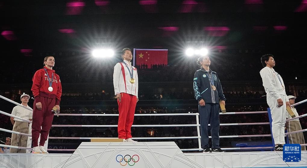 8月9日,冠军中国选手吴愉(左二)、亚军土耳其选手恰克尔奥卢(左一)和季军哈萨克斯坦选手克扎伊拜(右二)、菲律宾选手比列加斯在颁奖仪式上。新华社记者 江文耀 摄