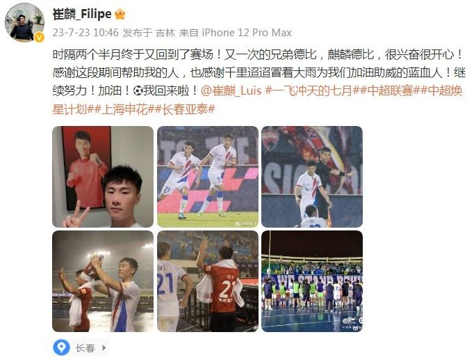 两个半月后终于复出的崔麟,在社媒晒照写道:“时隔两个半月终于又回到了赛场!又一次的兄弟德比,麒麟德比,很兴奋很开心!感谢这段期间帮助我的人,也感谢千里迢迢冒着大雨为我们加油助威的蓝血人!继续努力!加油!⚽️我回来啦!”
