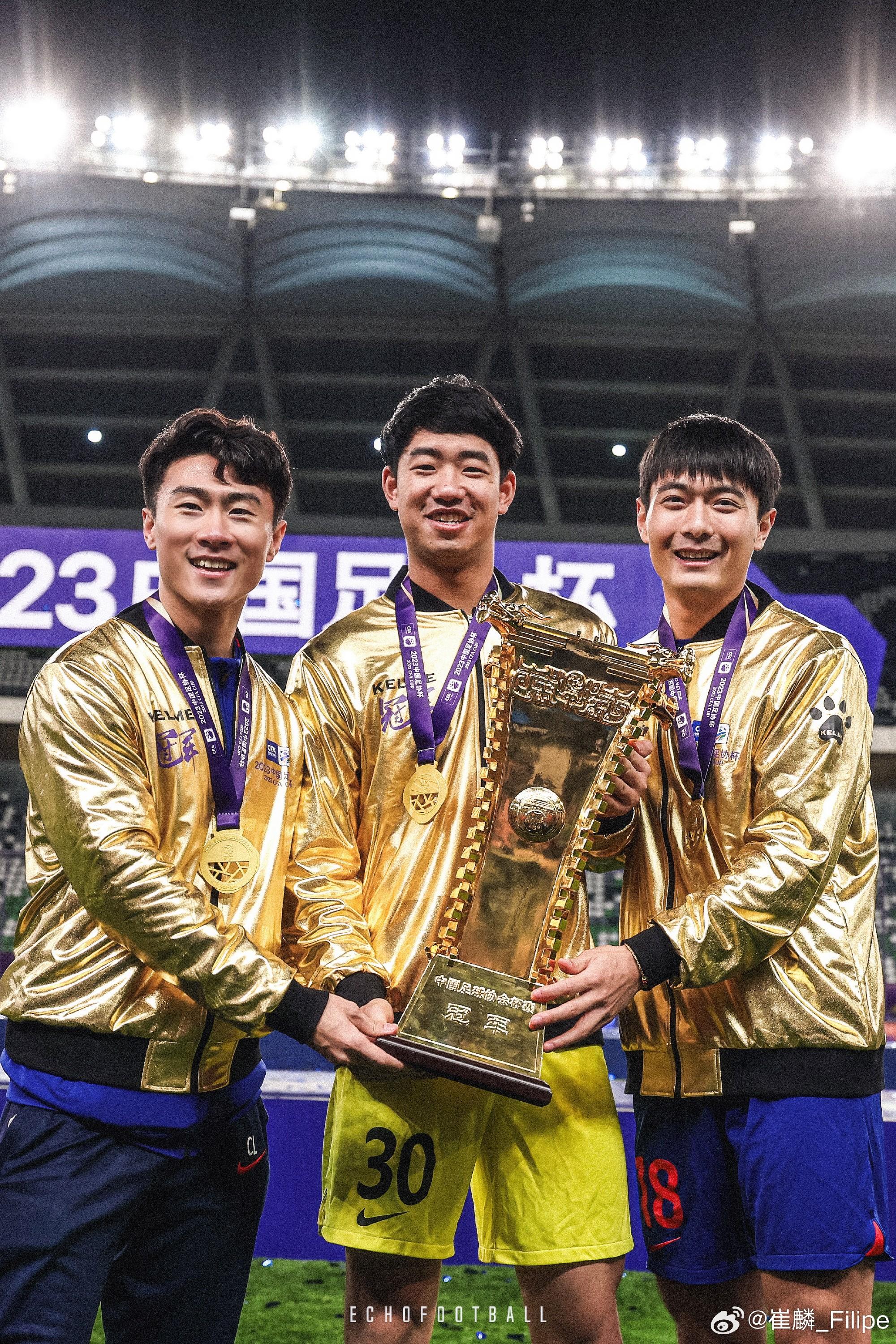 申花夺得足协杯冠军,因伤缺席的崔麟在社交媒体晒出捧杯照,庆祝夺冠。