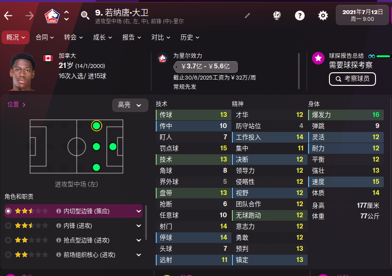 在FM22中,戴维的CA和PA分别为139和155,他的的射门、停球、工作投入和体质达到了14,点球为15,速度和爆发力分别为15和16。