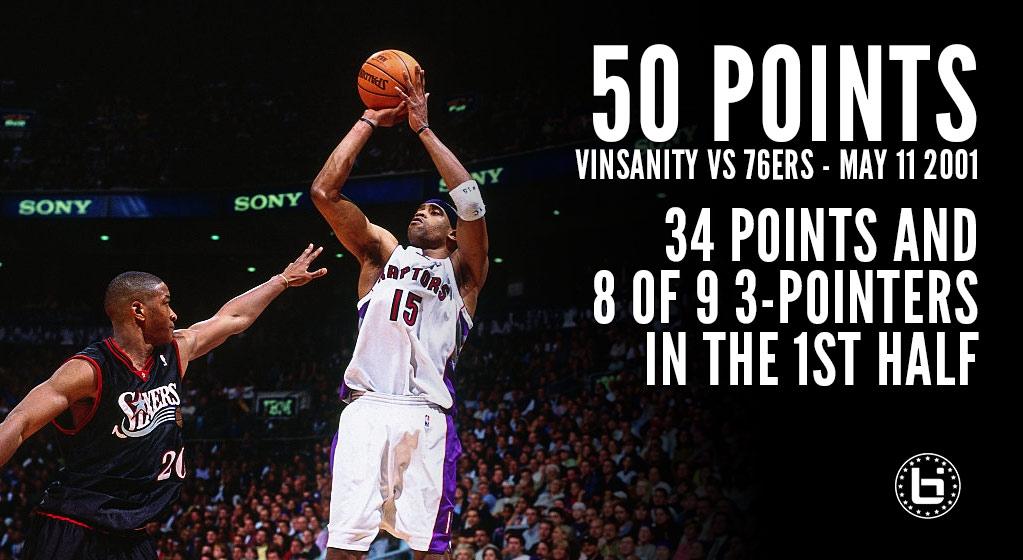 2001年5月11日,东区半决赛第三场多伦多猛龙主场迎战76人,卡特大发神威砍下50分,创造球队季后赛得分纪录,还投中了9个三分球,帮助球队102-78大胜对手,让猛龙取得系列赛2-1领先。