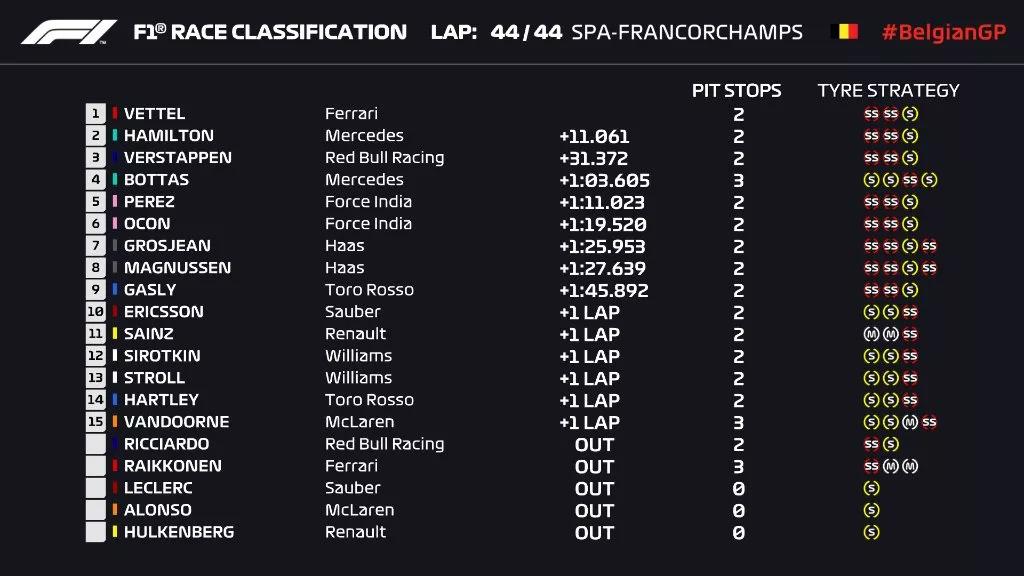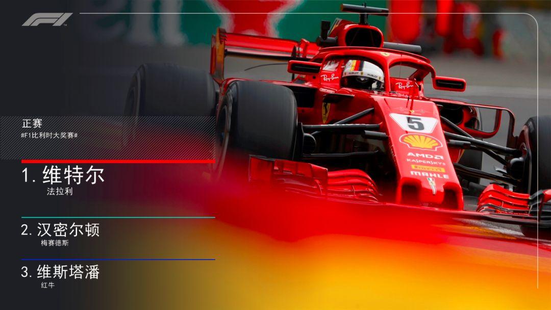 冲线!最终,维特尔夺得本场比赛的冠军,这是他本赛季的第5个冠军,也是他个人职业生涯的第52胜!汉密尔顿第二,维斯塔潘第三。同时,维特尔也被为本场比赛的最佳车手。