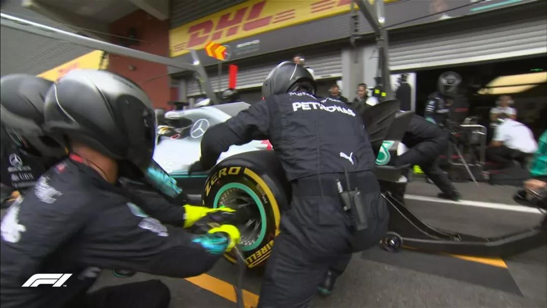 比赛进行到第22圈,汉密尔顿进站换上黄色软胎,出站后排在第三,正好跟在维斯塔潘身后3秒左右。