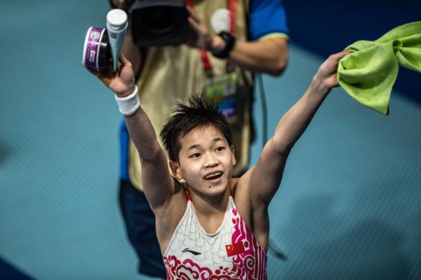 9月12日,广东队选手全红婵在比赛后向观众微笑致意。新华社记者陶亮摄