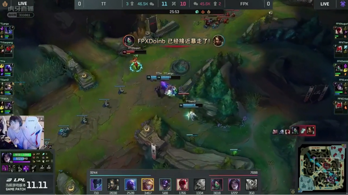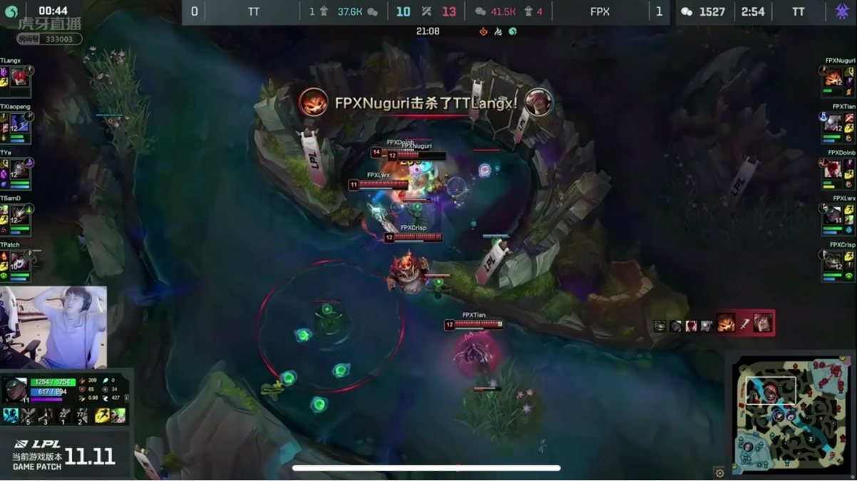 事情就发生在LPL夏季赛常规赛,FPX迎战弱旅TT。上一场惜败LNG的确让FPX众将心态受到一定影响,首局迟迟未能突破TT防线,好在决胜团Doinb阿卡丽飞雷神之术秒杀TT输出核心后助FPX赢下首局。