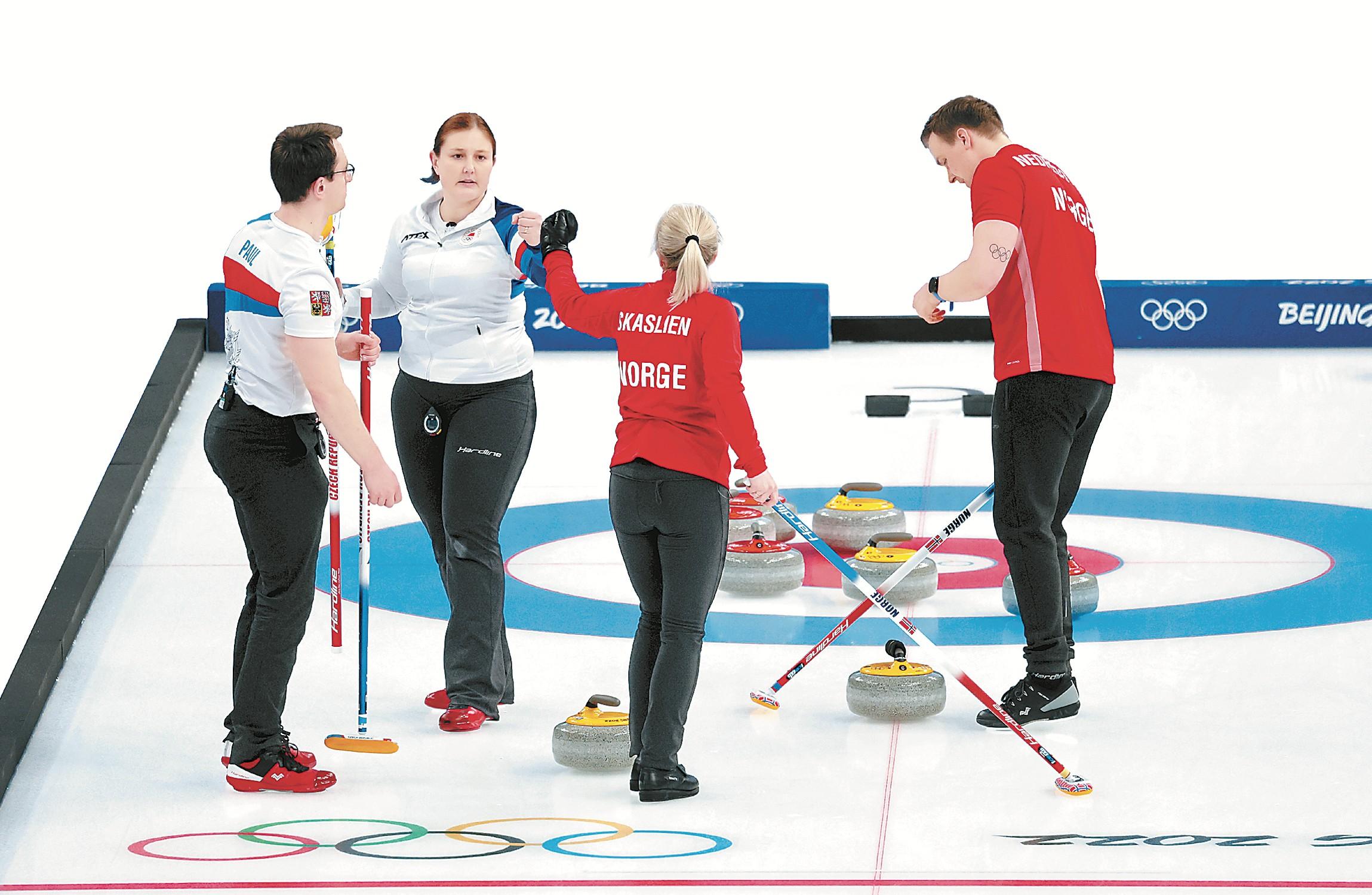 北京2022年冬奥会冰壶混双循环赛第1轮,捷克组合保罗/保洛娃和挪威组合芒努斯/克丽斯廷在比赛中。 IC photo 供图