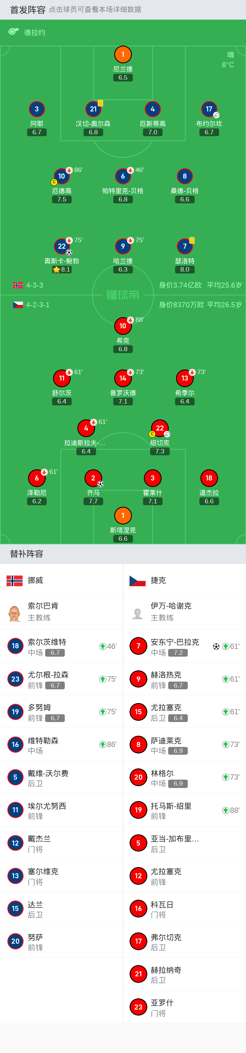 挪威 首发:1-尼兰德, 7-瑟洛特, 21-汉切-奥尔森, 6-帕特里克-贝格, 10-厄德高, 3-阿耶, 8-桑德-贝格, 17-布约尔坎, 9-哈兰德, 4-厄斯蒂高, 22-奥斯卡-鲍勃
