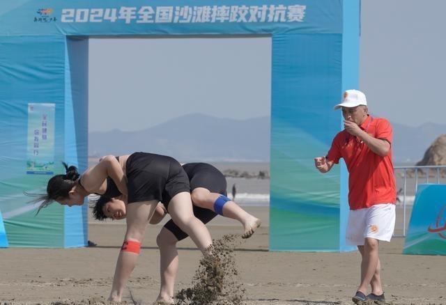 与此同时,沙滩上的另一场比赛也异常激烈。项滨滨,一位来自浙江的女摔跤手,身材不高但肌肉线条分明。她的对手是一名练习国际式摔跤的高手,身高优势明显。两人站在沙圈,四目相对,气氛瞬间紧张起来。