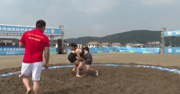 对手反应极快,双手用力推开了项滨滨,两人重新站定,气氛更加紧张。项滨滨深吸一口气,调整呼吸,她知道自己不能再贸然进攻,必须等待对手露出破绽。几秒钟后,对手果然开始主动进攻,项滨滨瞅准时机,一个迅猛的低身扑击,将对手的重心彻底打乱,直接将她摔倒在沙地上。