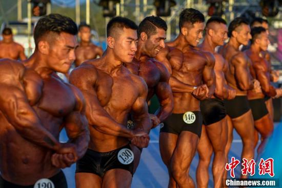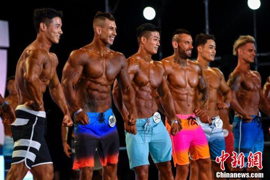 图为参加男子健美选手在比赛中展示健硕肌肉。 骆云飞 摄