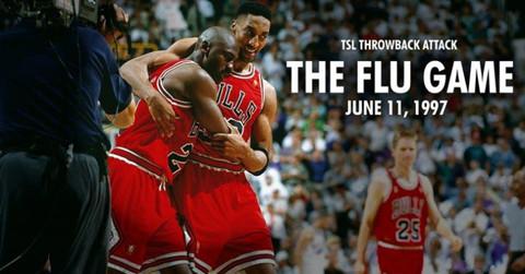 97年NBA总决赛第五场比赛,乔丹率领公牛客场挑战爵士队,乔丹在赛前得了流感,发着高烧全场砍下38分,其中有15分在关键的第四节所得,最后时刻更是命中关键的3分,最终公牛以90比88战胜骑士,为夺冠奠定了良好的基础,比赛结束后乔丹几乎虚脱,靠在皮蓬的怀里,这一画面也成为了NBA经典的瞬间。