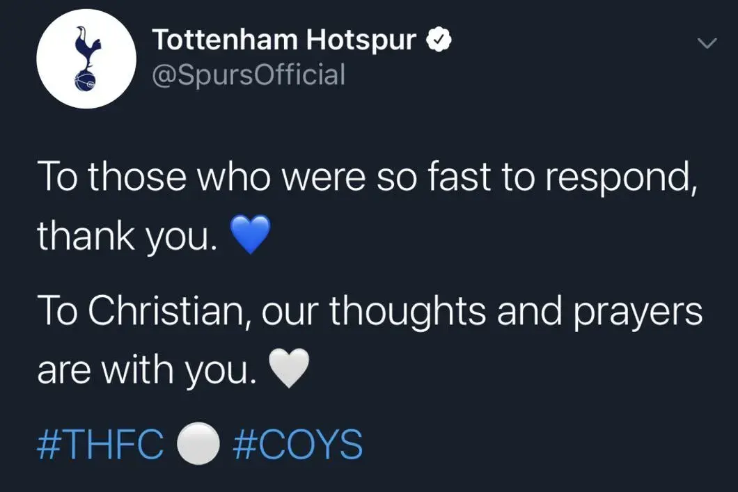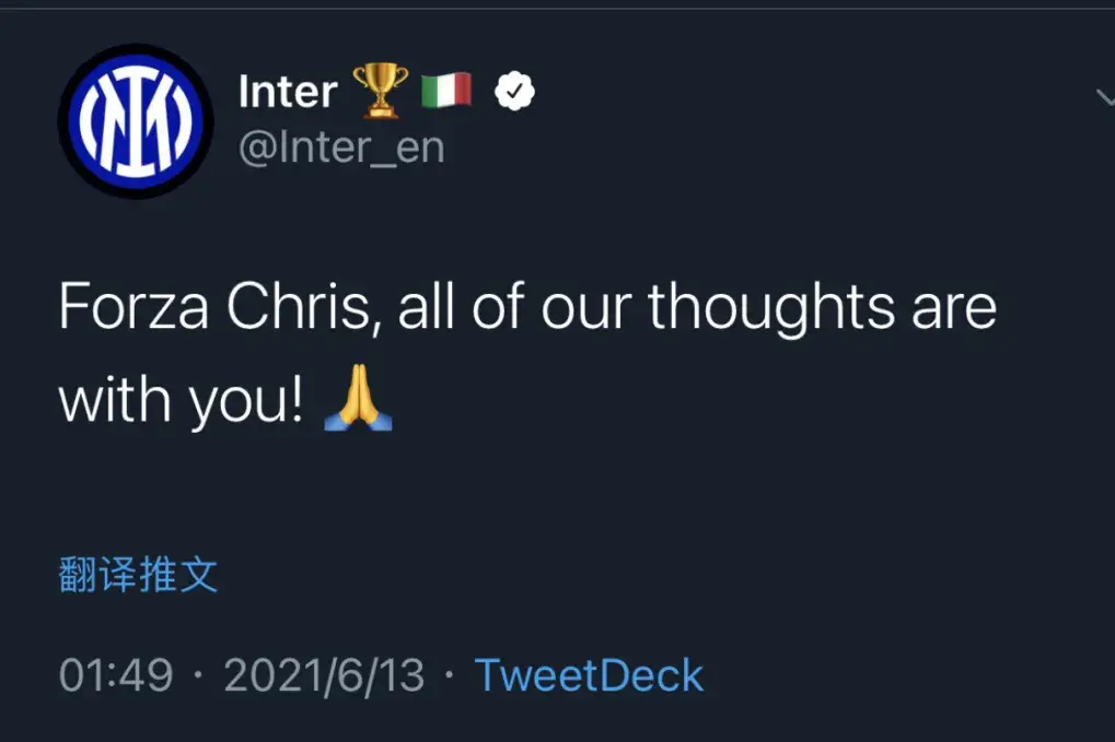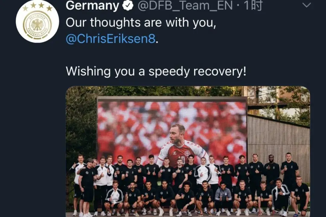 随之而来的祝福也填满了整个社交媒体,包括国米、热刺、皇马在内的多家俱乐部送上祝福,德国国家队甚至在第一时间将埃里克森的照片放上大屏幕,全队为其加油。