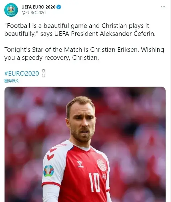 而在比赛结束之后,2020欧锦赛赛事官方将本场比赛最佳球员颁给了克里斯蒂安·埃里克森,愿埃里克森能够早日康复。文中提到了欧足联主席切费林对埃里克森的评价,“足球是一项美丽的运动,克里斯蒂安将其诠释地如此美丽”