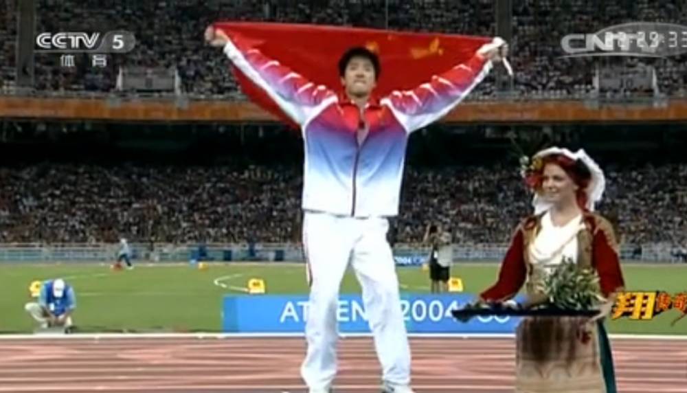 裁判跑了出来,帮助刘翔及时地减速。转身的刘翔看到了蜂拥而至的摄像师们,他接到了工作人员递来的中国国旗,他向场边的观众们致意,他高举国旗,将五星红旗披于肩上,好似凯旋而归的将军在接受着最高的欢呼和最热烈的拥簇。而雅典奥林匹克体育场的55000名观众更是罕见地全体起立,为这位黄皮肤的中国人送上了最高级别的欢呼。