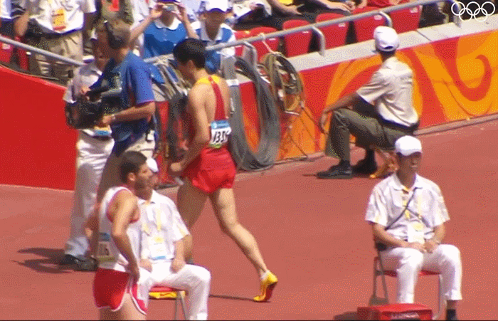 55000名观众里并没有太多中国人,有一位中国的中年大叔试图冲过安保人员和刘翔说几句,没有太多力气的他,仍然小跑过去,跟安保人员示意之后和大叔拥抱在了一起……