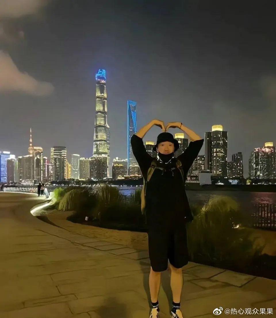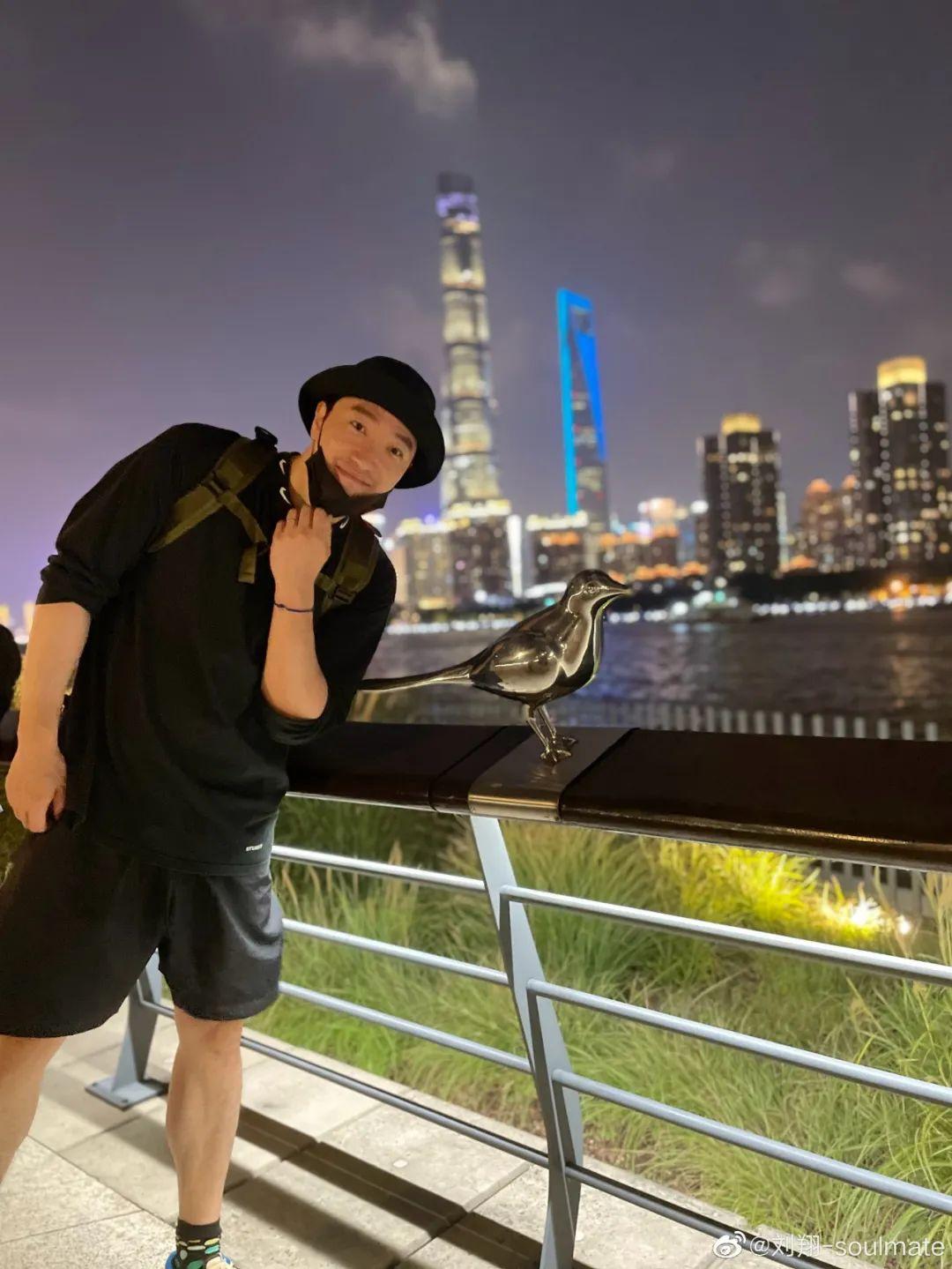 照片中的刘翔,于夜色中,着一身黑装,在黄浦江边跑步。