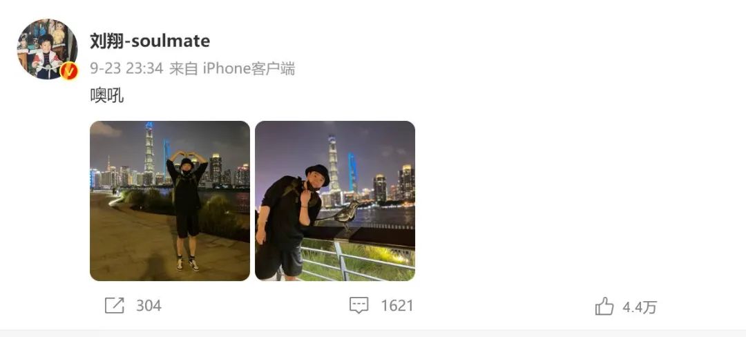 照片是刘翔在个人账号发布的,配文是“噢吼”。